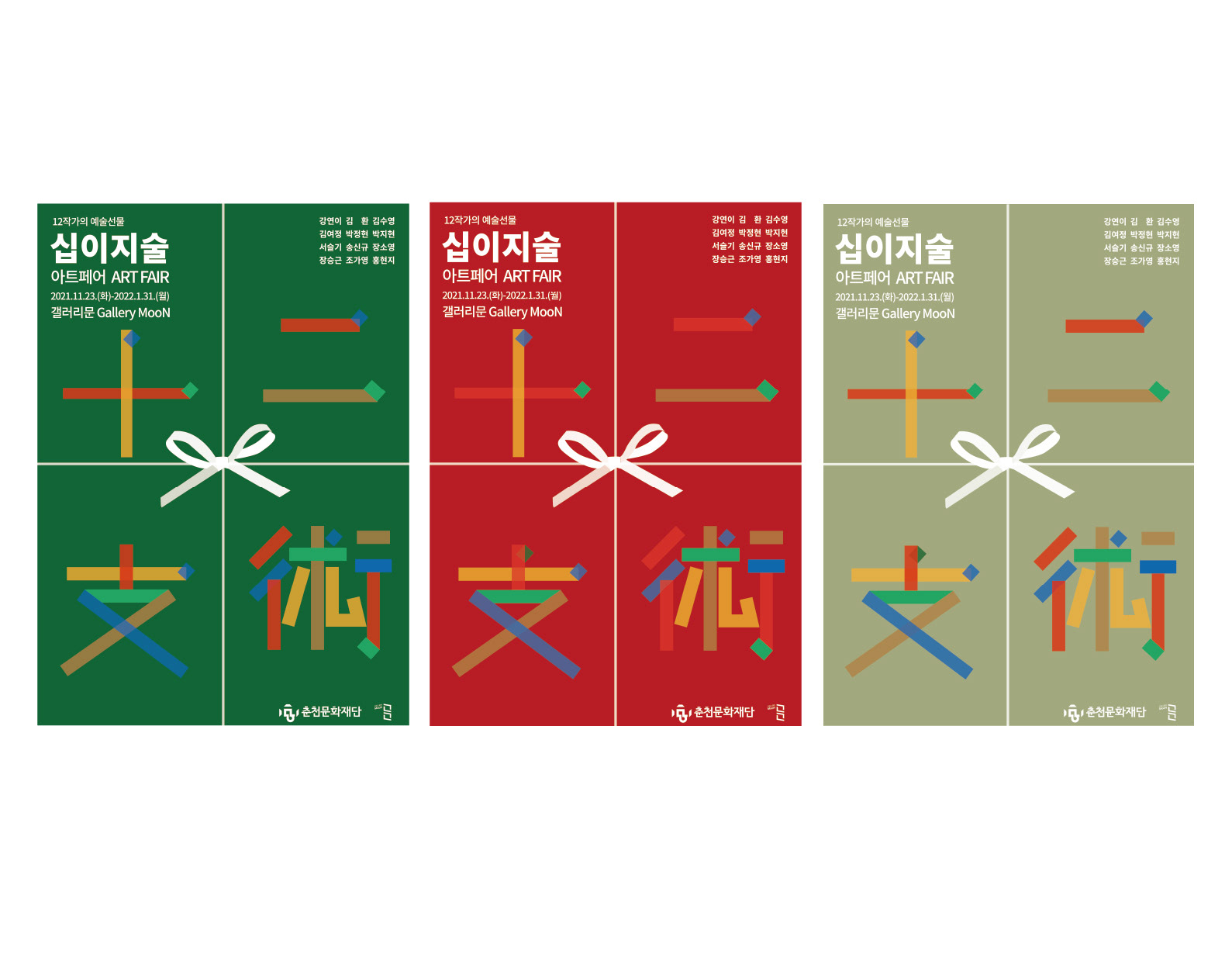 12월의 선물 같은 전시가 되었으면 하는 바람을 담아 포스터를 작업했다. 12간지에서 떠올린 십이지술은 12명의 작가의 작품을 전시하고 경매행사하는 전시이다. 연말 느낌이 나도록 빨간색과 초록색을 사용했다.