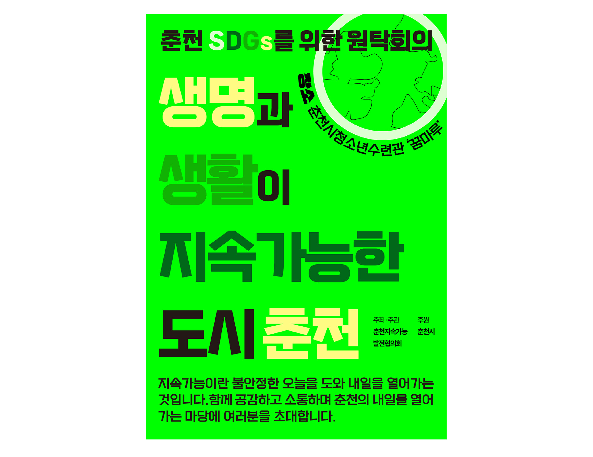 춘천지속가능발전위원회에서 포스터를 의뢰해주셨습니다. 좋은 의미에서 진행되는 행사인만큼 더 신경써서 작업을 했던 기억이 납니다. 웹포스터로 진행되기에 형광색으로 눈에 띄도록 작업을 하였고, 포스터에 원탁을 잘 보일 수 있도록 진행했습니다. 전에 진행되었던 작업에서도 너무 크게 차이가 나지 않도록 신경써서 작업했습니다.
