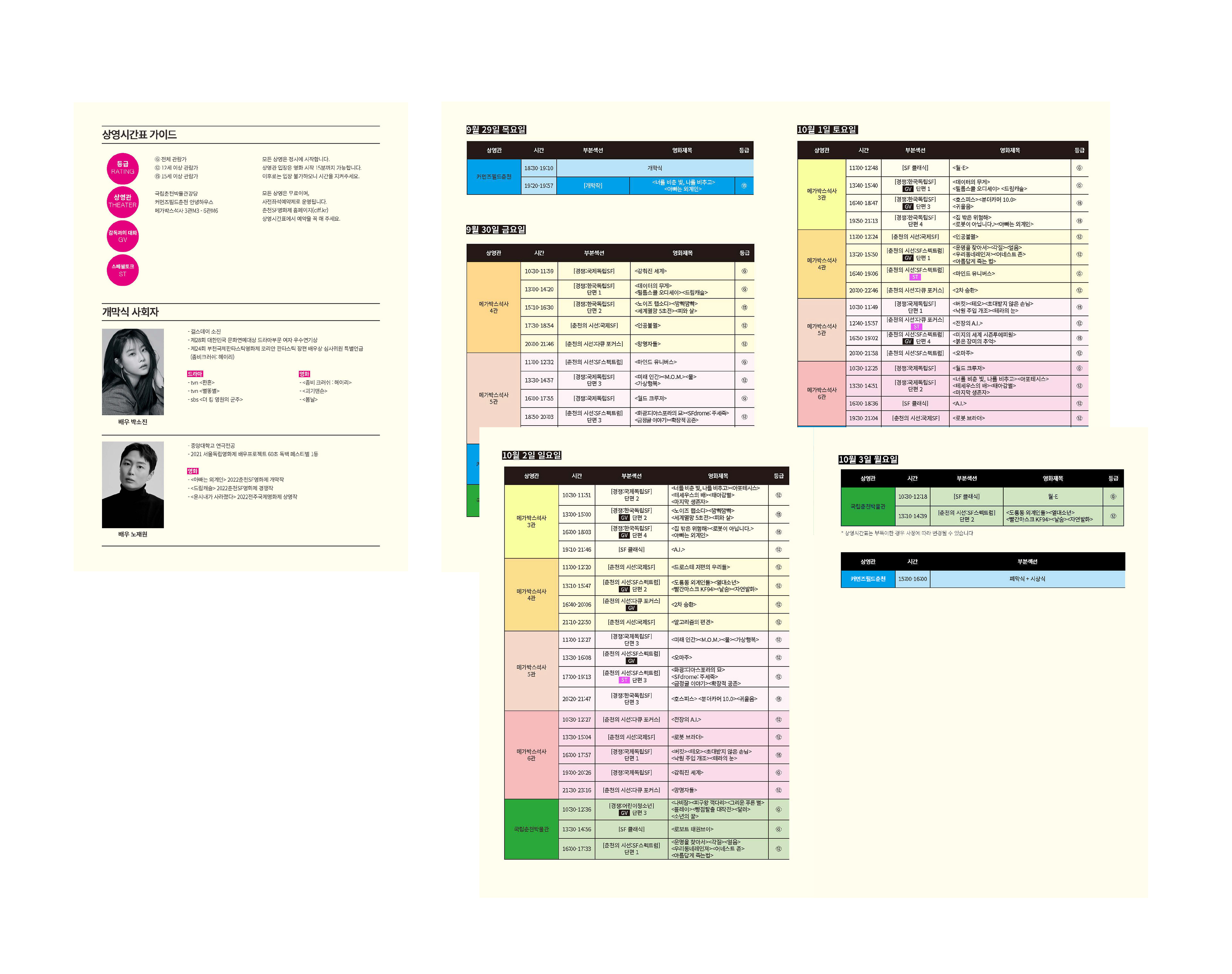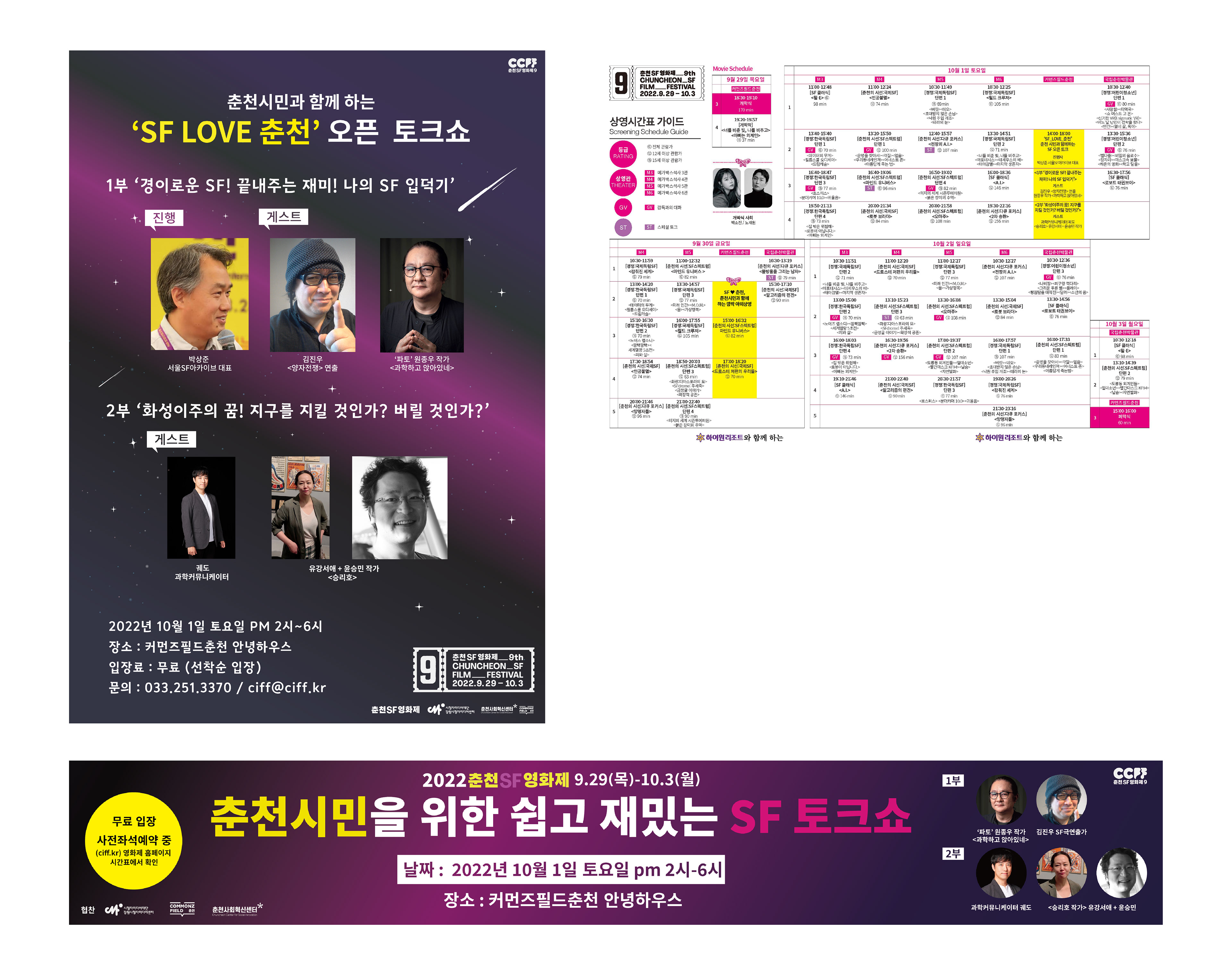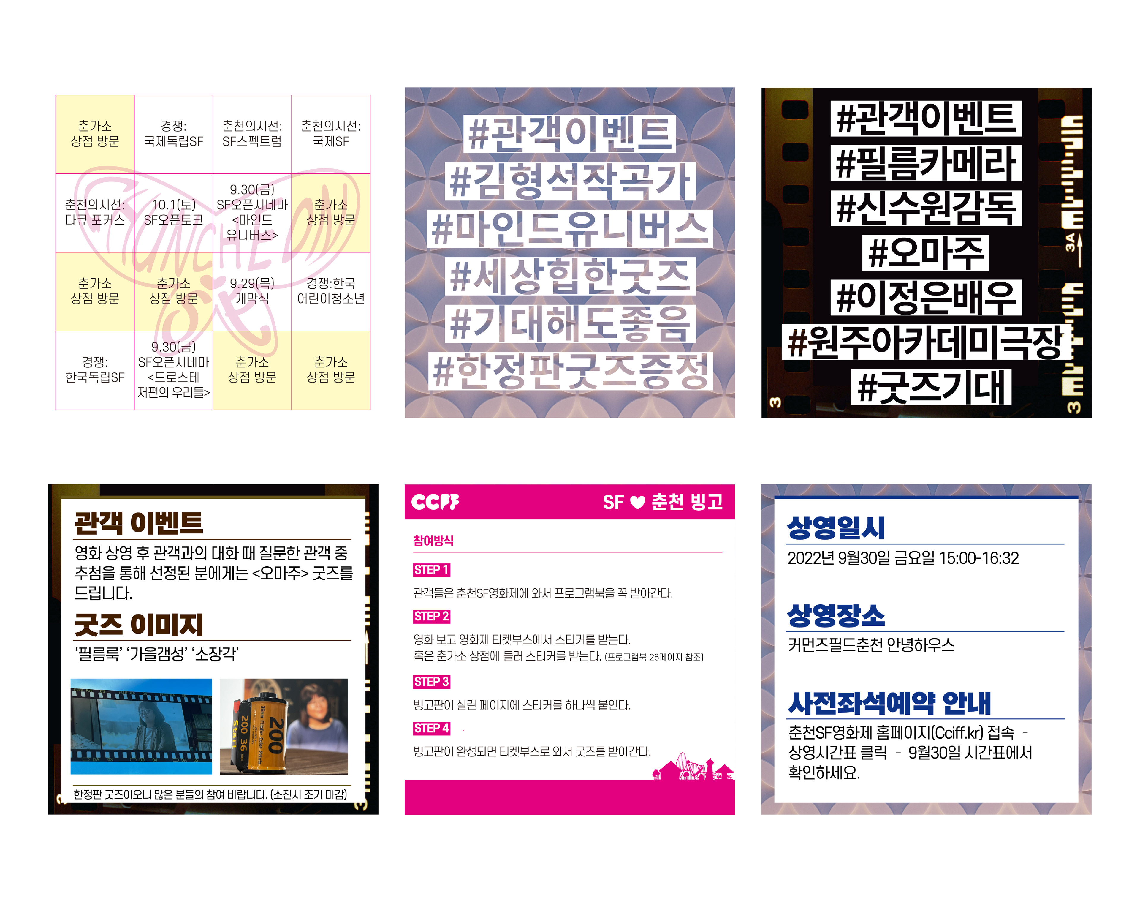 프로그램북(일부), 상영시간표, 스페셜토크 포스터, 백월, 가로등, 대형 현수막, 카드뉴스, 티셔츠 디자인, 포스터 로고 디자인
